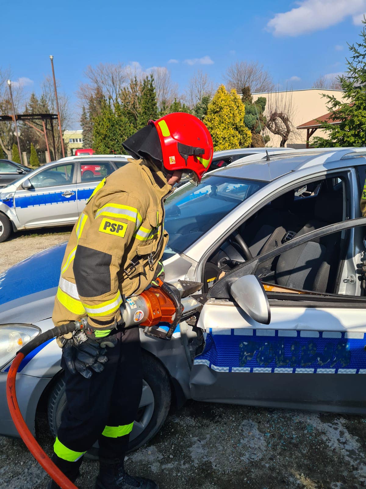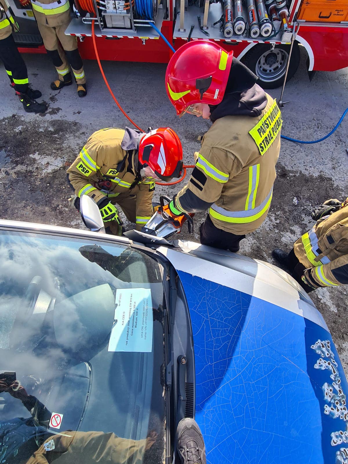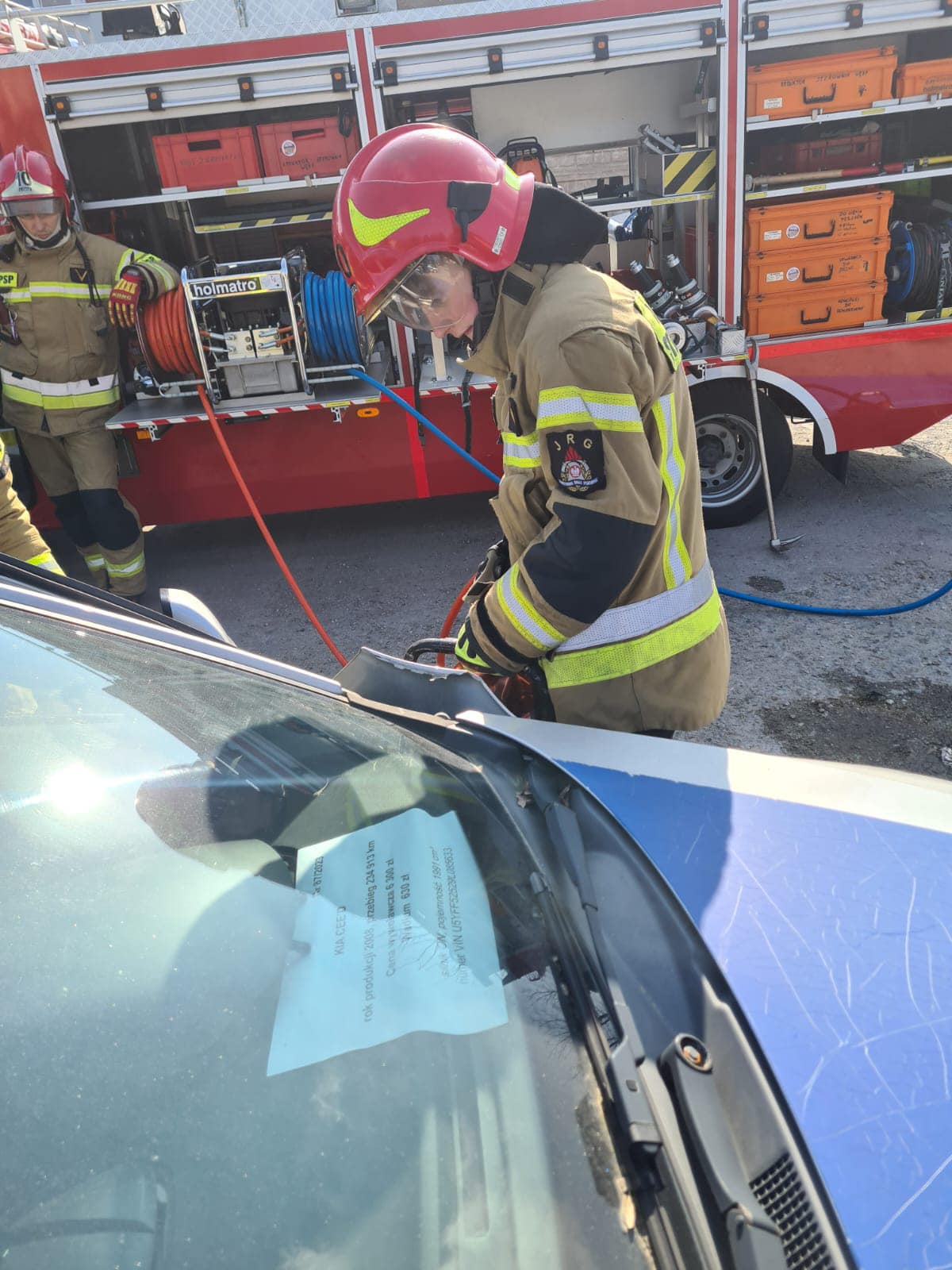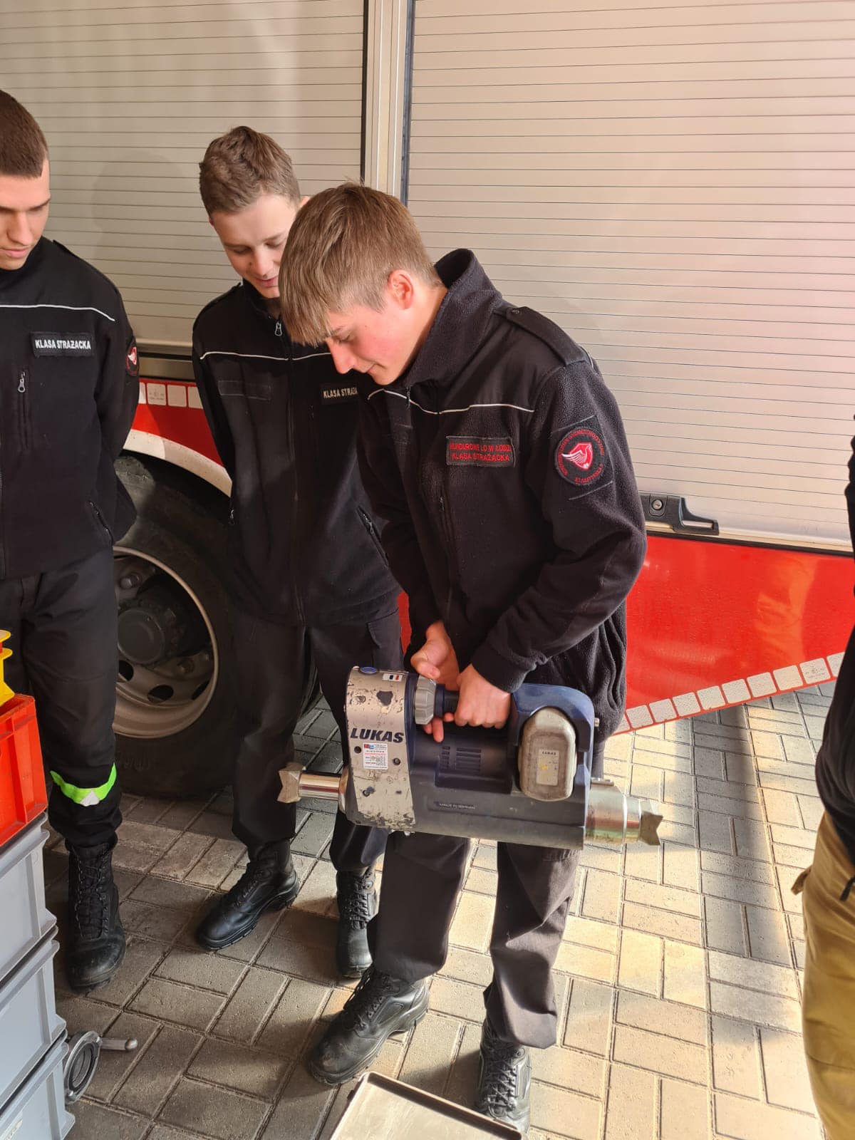 Na koniec długiego dnia nasi Gospodarze, wykorzystując sprzyjające warunki atmosferyczne i zaangażowanie uczniów, pokazali zasadę działania sprzętu hydraulicznego, służącego do uwalniania zakleszczonych osób w wypadkach drogowych.